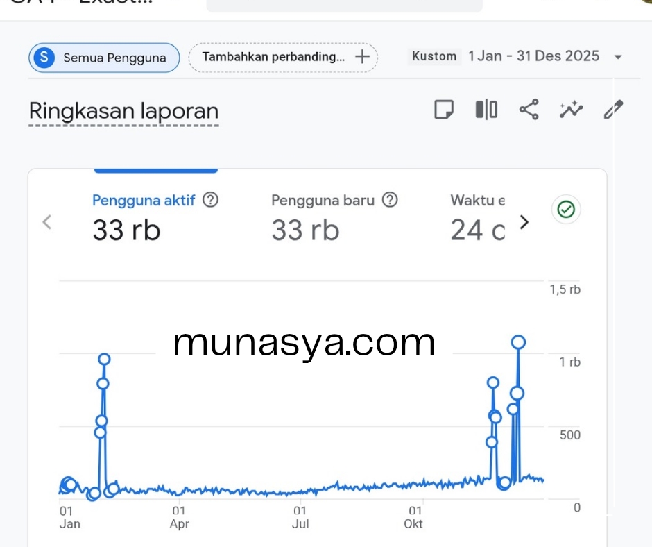 Berdasarkan data Google Analytik 4 (GA4) mulai 1 Januari 2025 hingga 31 Desember 2025 , Pageview Blog Munasya totalnya adalah 43 ribu dengan rasio rata-rata 24 detik. Itu berarti dalam satu hari terdapat 100-200 kunjungan. Atau dalam satu bulan sekitar 3.500 kunjungan.